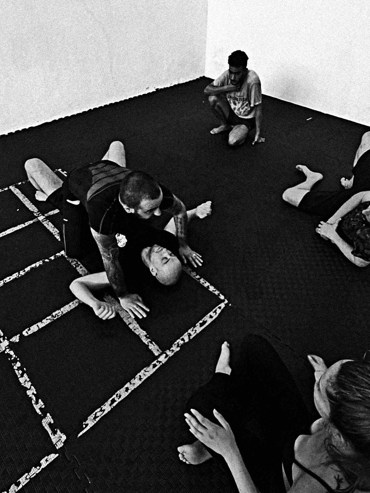 The Dojo is described as an essential space for the collective and the surrounding artistic community. More than a room with tatami, it functions as a hub for somatic practices that support the work of dancers, performers, and artists. The four free weekly sessions include martial arts, meditation, breathing, coordination, and strengthening, directly influencing creative and choreographic processes.